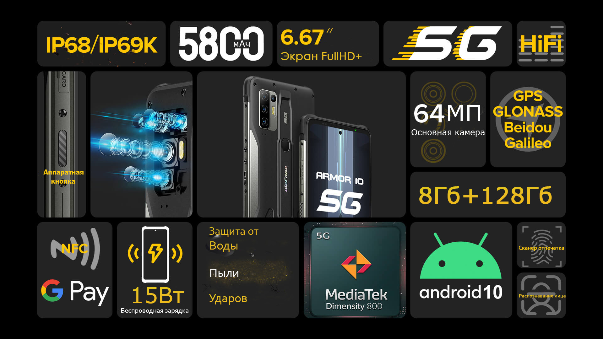 В Ulefone Armor 10 5G установлена камера 64Мп, которая позволяет снимать фото в разрешении 9248 x 6936, что обеспечивает высочайшую точность и детализацию изображений. Размер сенсора камеры 1/1.72", что позволяет делать на Ulefone Armor 10 5G яркие насыщенные кадры с применением технологии Tetracell HRD в реальном времени.