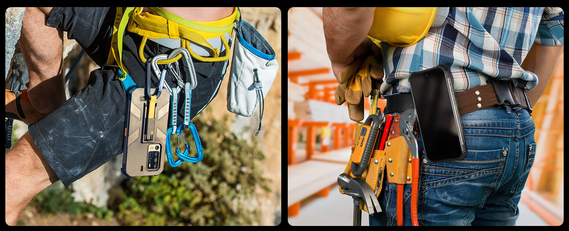 В чехле присутствует клипса, которая поворачивается на 180°, также можно установить крепление для карабина. С чехлом смартфон стал более портативным.