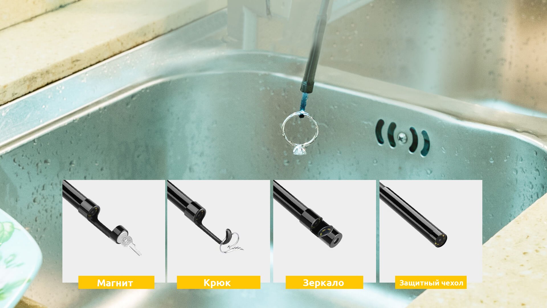 В комплекте присутствует зеркало для увеличения угла обзора, крючок для захвата предметов, магнит для металлических предметов, защитный чехол для защиты камеры эндоскопа.