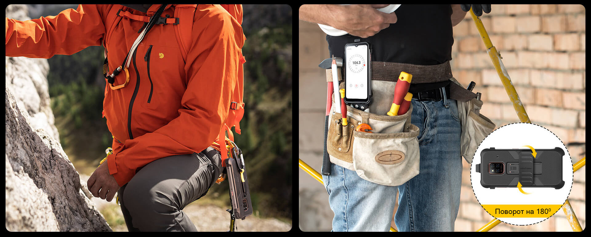 В чехле присутствует клипса, которая поворачивается на 180°, также можно установить крепление для карабина. С чехлом смартфон стал более портативным.